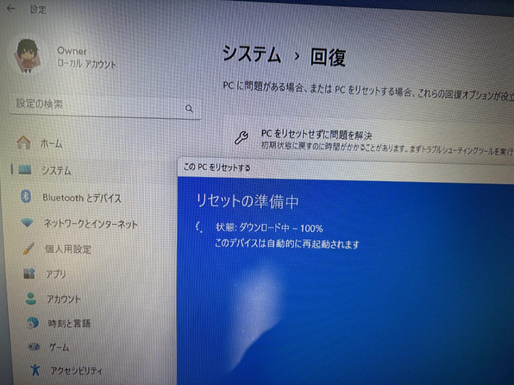 感慨深かったけど、Microsoftアカウントログインのほうが「自分のPCだ」とよりはっきりわかるから、リセット決行。